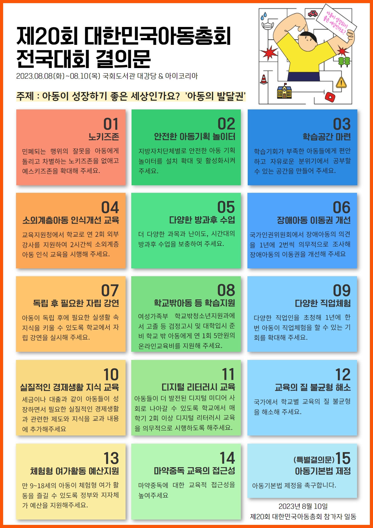 ●2023년 제20회 대한민국아동총회 전국대회 결과 안내 2023년 제22회 대한민국아동총회 전국대회는8월 8일부터 10일까지 전국 아동대표들이 참석한 가운데국회, 국제청소년센터에서 진행되었습니다.이번 대회는'아동이 성장하기