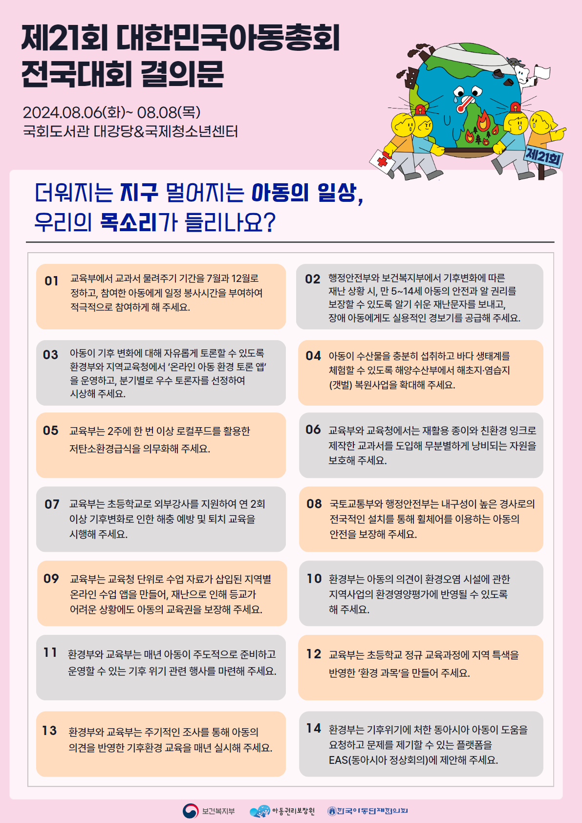 ●2024년 제21회 대한민국아동총회 전국대회 결과 안내 2024년 제21회 대한민국아동총회 전국대회는 8월 6일부터 8일까지 전국 아동대표들이 참석한 가운데국회, 국제청소년센터에서 진행되었습니다. 이번 대회는 ‘디지털 환경 속에서 모든 아동이 행복한
