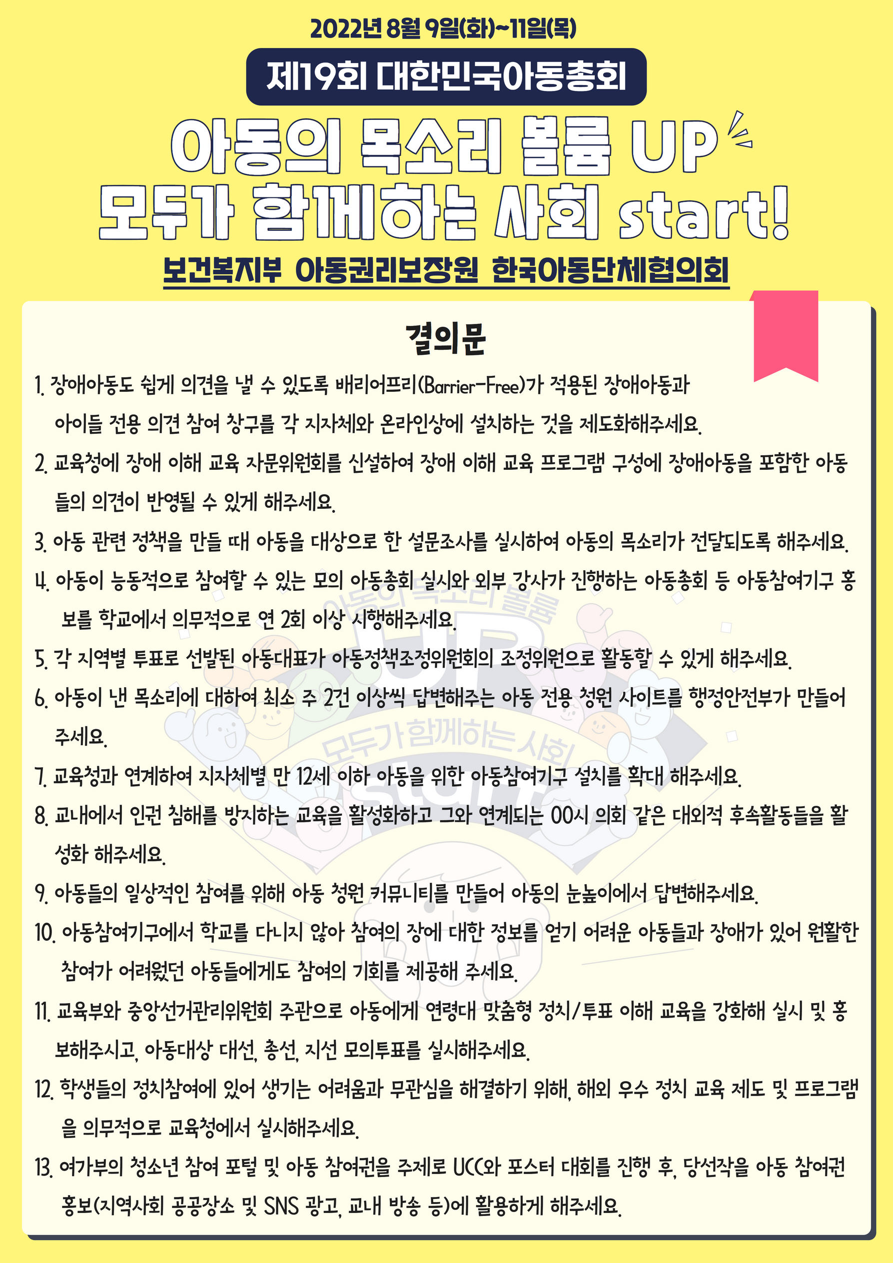 ●2022년 제19회 대한민국아동총회 전국대회 결과 안내 2022년 제19회 대한민국아동총회 전국대회는8월 9일부터 11일까지 전국 아동대표들이 참석한 가운데하이서울유스호스텔 지하 1층 대강당, 온라인(Youtube·ZOOM)에서 진행되었습니다.이번