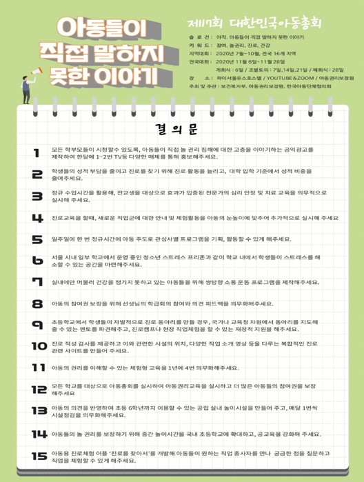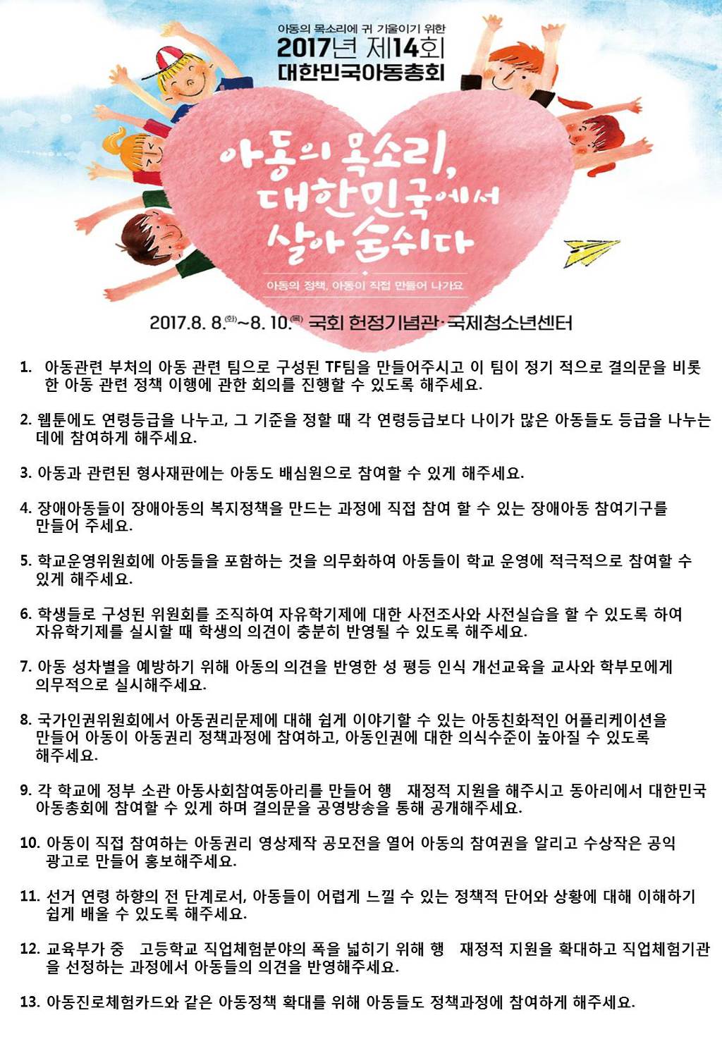 ●2017년 제14회 대한민국아동총회 전국대회 결과 안내 2017년 제14회 대한민국아동총회 전국대회는8월 8일부터 10일까지 전국 아동대표들이 참석한 가운데국회도서관, 국제청소년센터에서 진행되었습니다.이번 대회는‘아동의 목소리 대한민국에서 살아 숨쉬