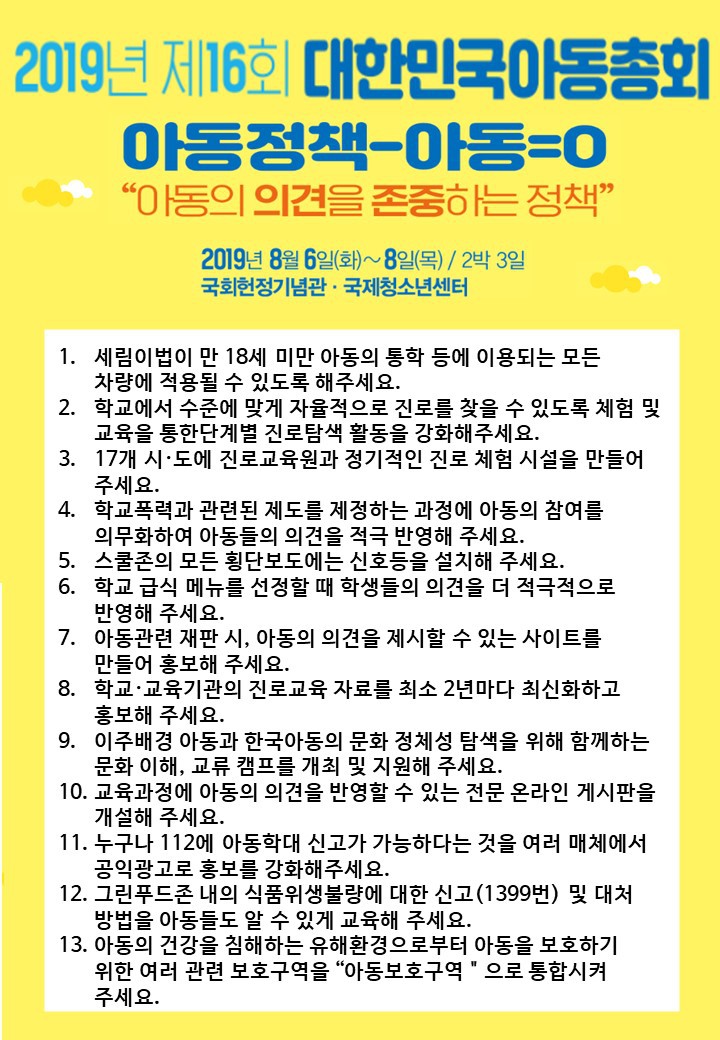 ●2019년 제16회 대한민국아동총회 전국대회 결과 안내 2019년 제16회 대한민국아동총회 전국대회는8월 6일부터 8일까지 전국 아동대표들이 참석한 가운데국회, 국제청소년센터에서 진행되었습니다.이번 대회는‘아동정책-아동=0, 아동의 의견을 존중하는