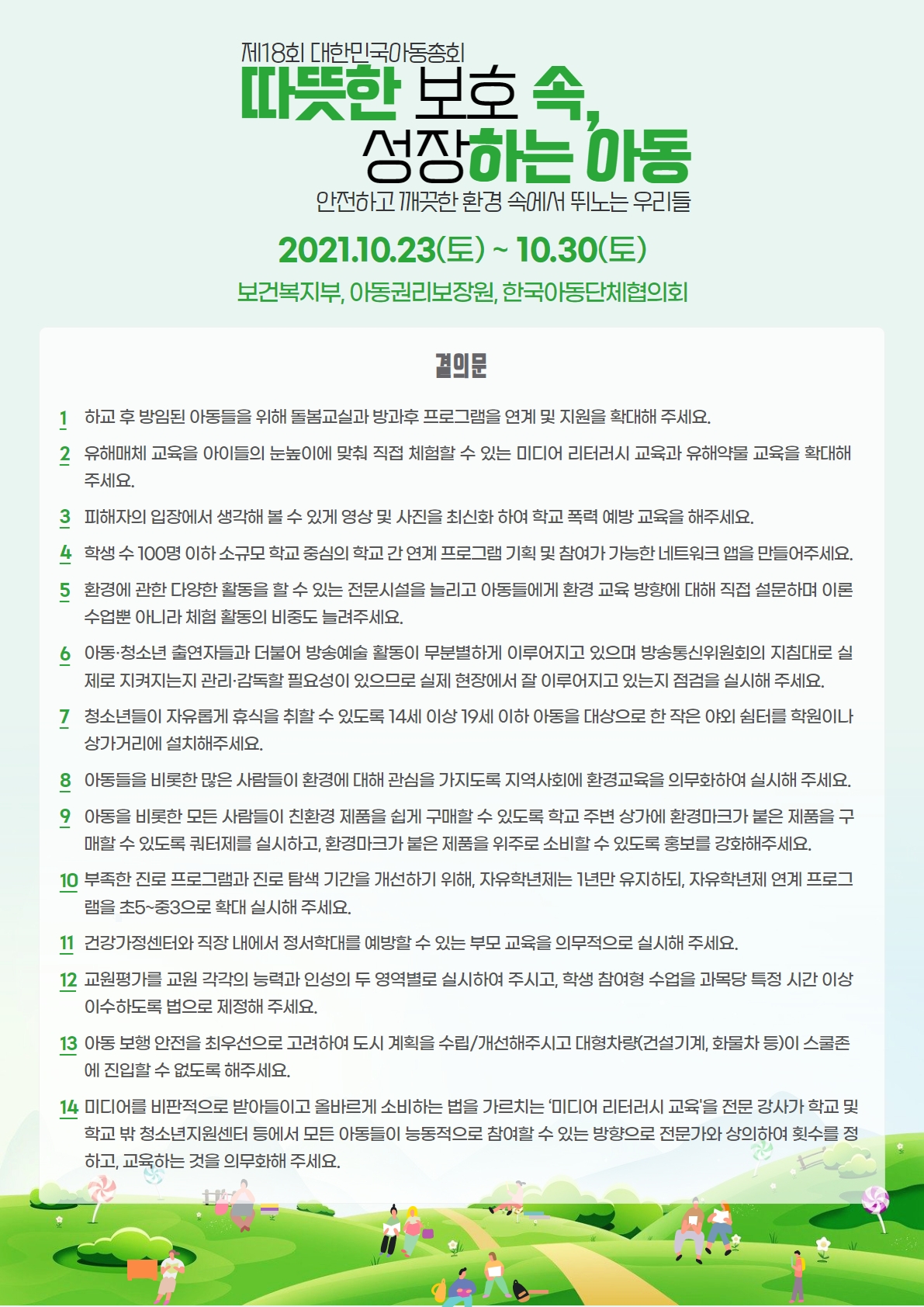 ●2021년 제18회 대한민국아동총회 전국대회 결과 안내 2021년 제18회 대한민국아동총회 전국대회는8월 23일부터 30일까지 전국 아동대표들이 참석한 가운데아동권리보장원, 전국지역아동센터협의회,온라인(Youtube, ZOOM)에서 진행되었습니다.이